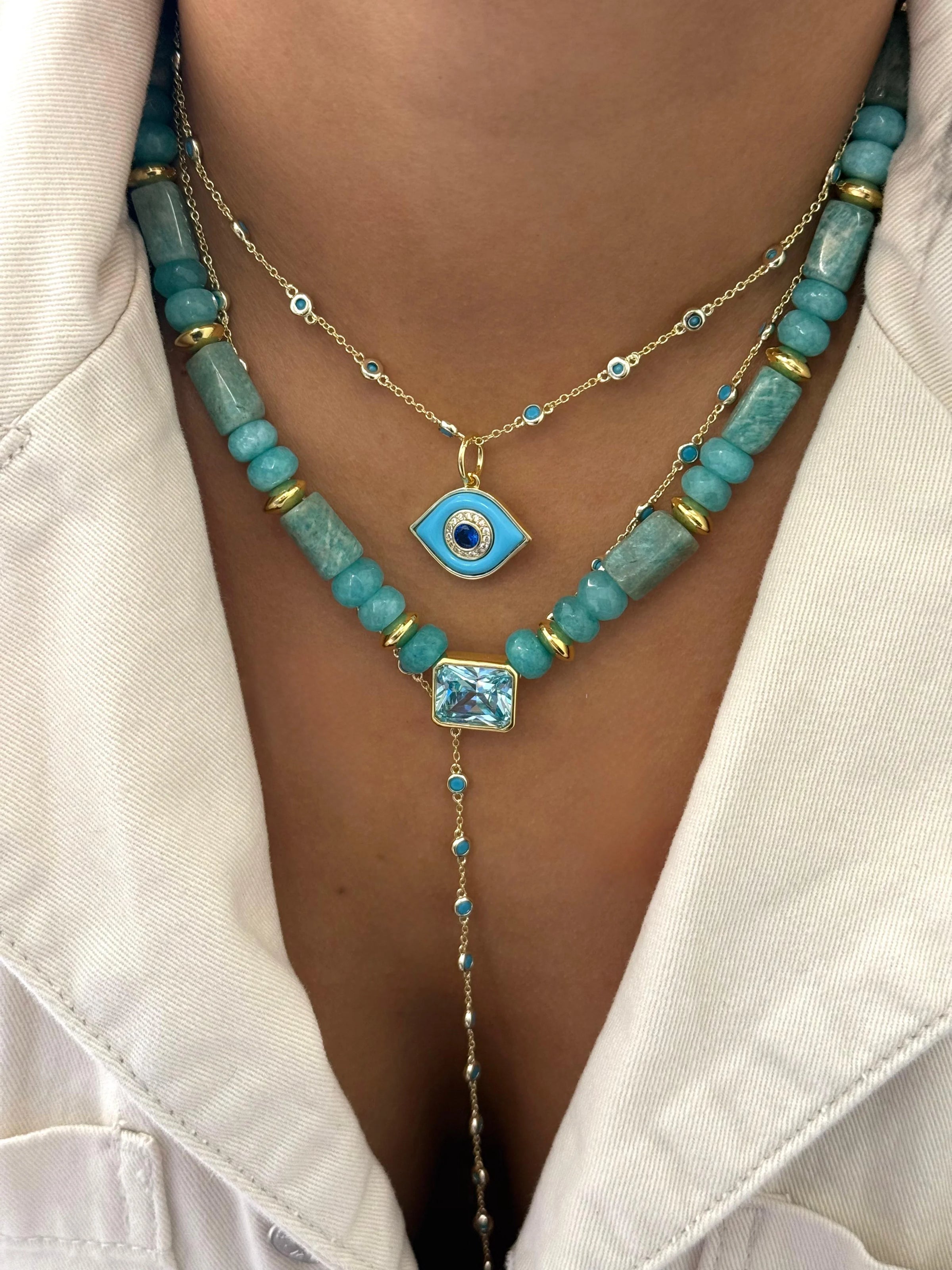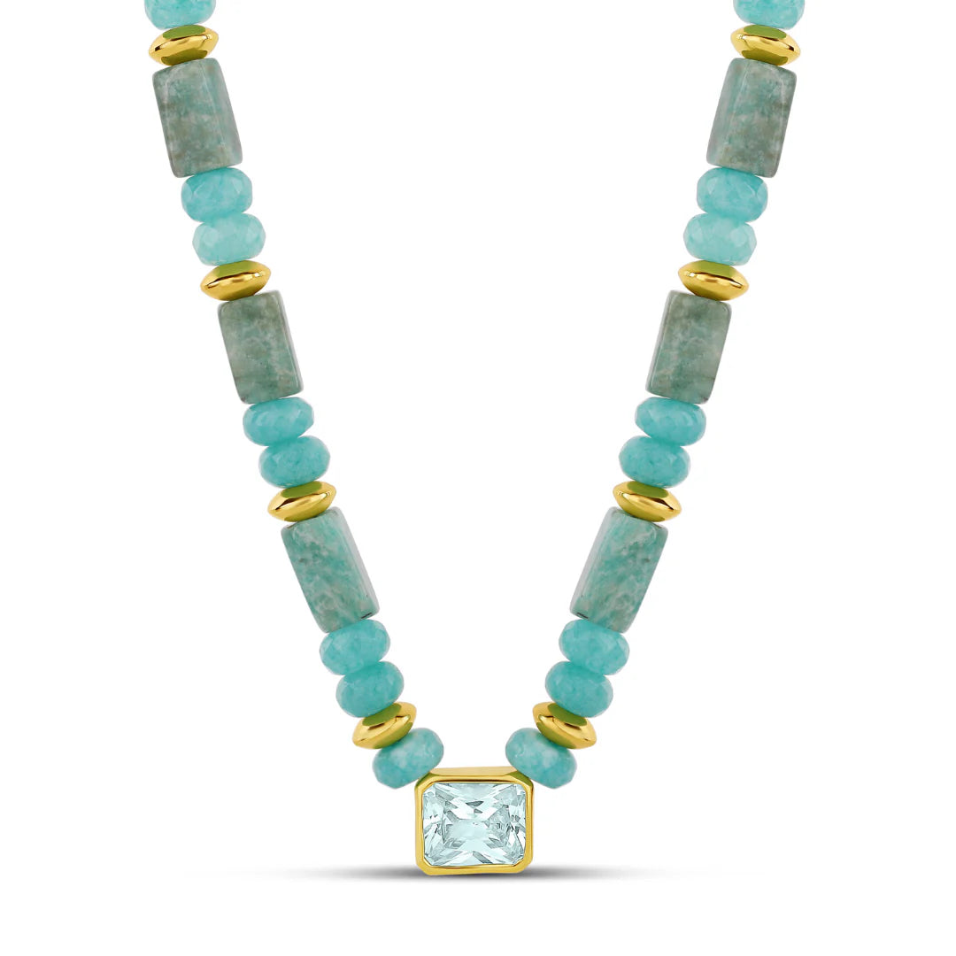 An elegant fusion of deep blue cylindrical beads, shimmering faceted stones, and warm golden accents. At its heart sits a striking 12 mm square-cut aqua cubic zirconia, creating the perfect balance of color and texture. Designed to stand out yet remain versatile, this necklace transitions effortlessly from day to evening wear.
