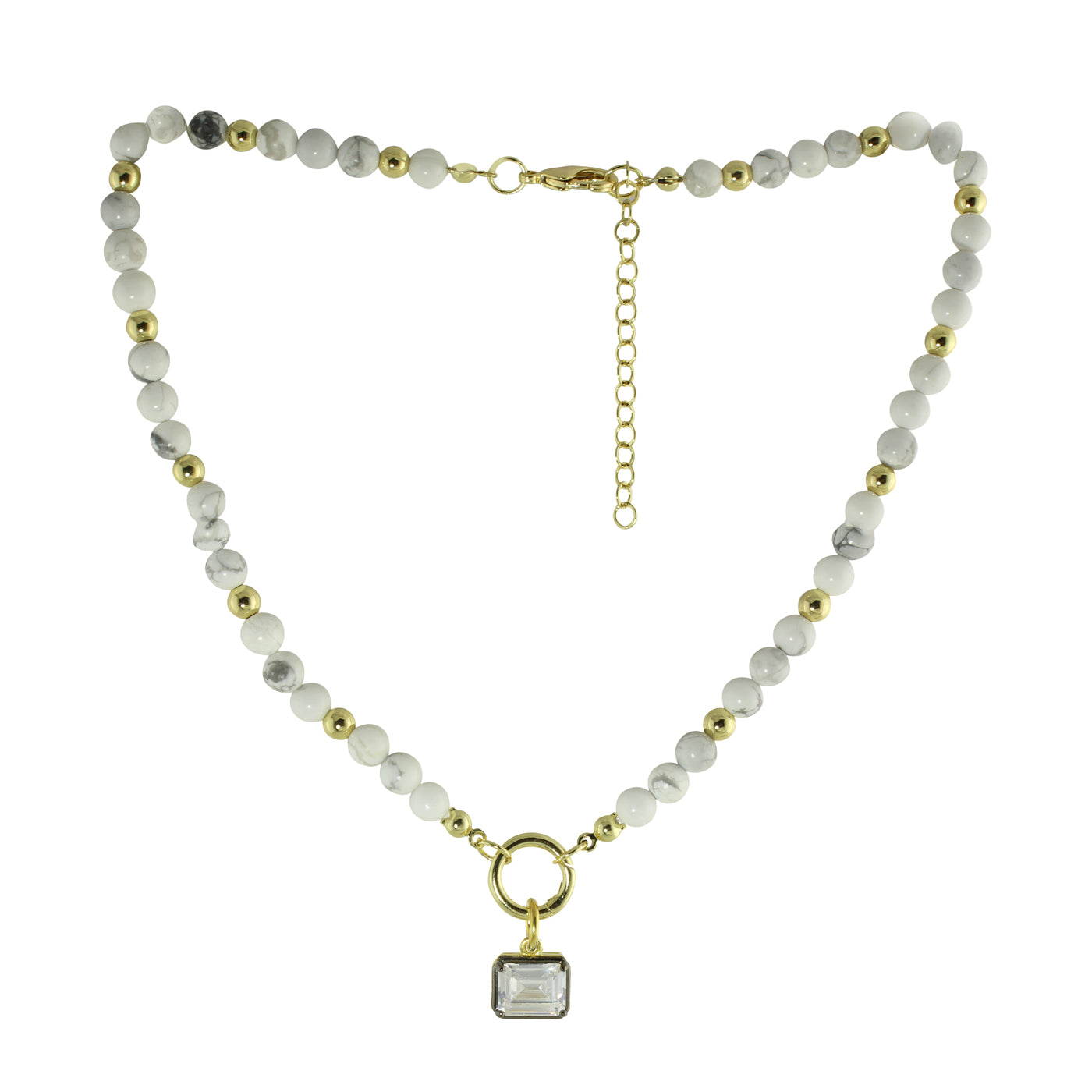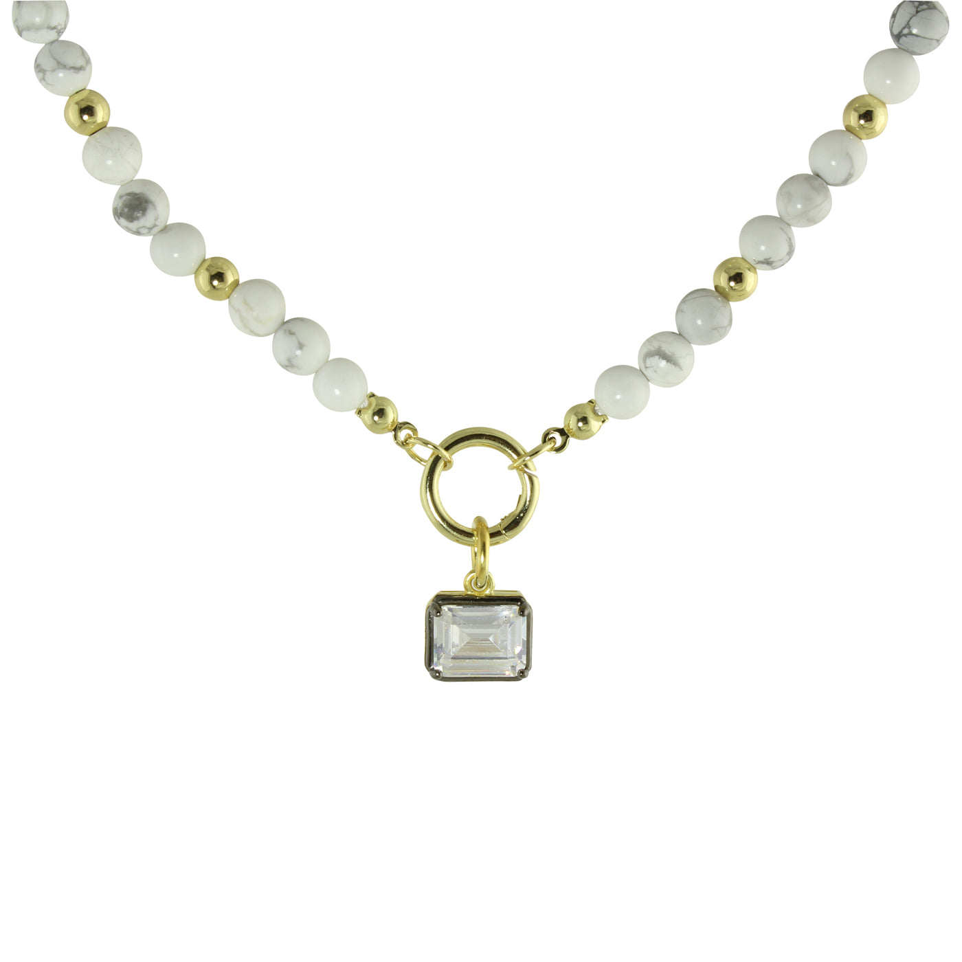 White stone necklace with gold details & emerald cut cz center stone pendant 16-18”