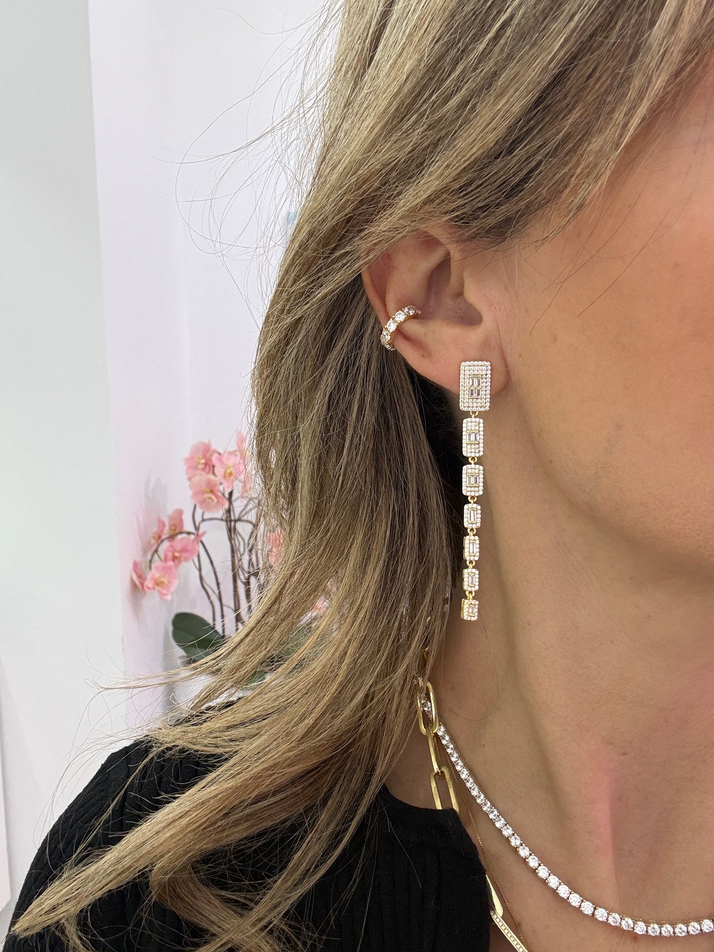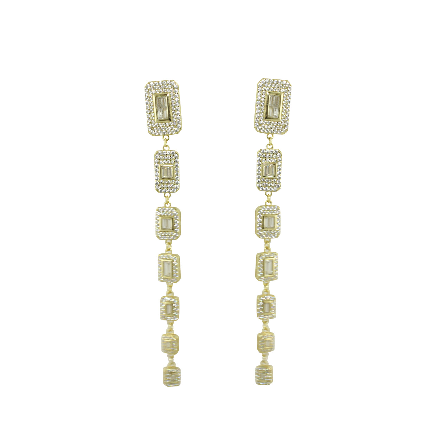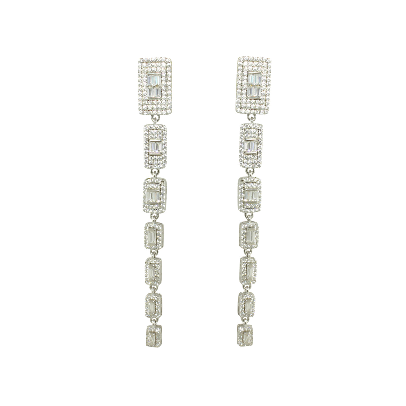 Sterling silver with rhodium or 14k gold graduating emerald cut drop earrings with post back. 2.75” drop