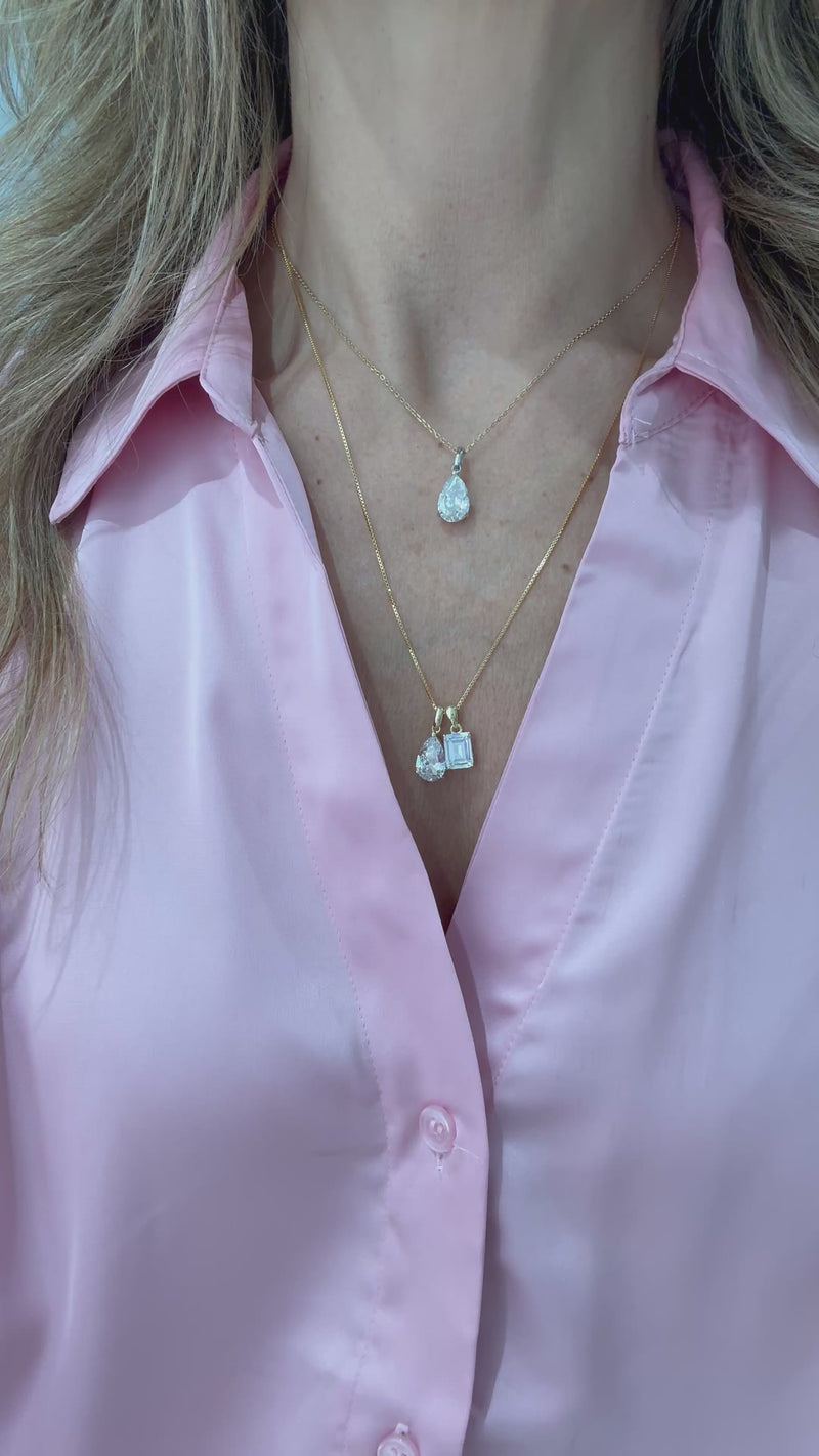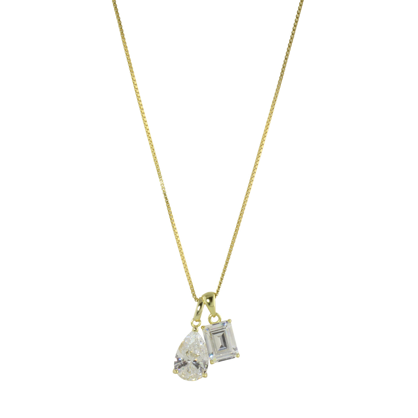 Stunning 2 stone solitaire necklace features 2 14k vermeil solitaire pendants, a pear shaped and an emerald cut on a 20” 14k vermeil box chain