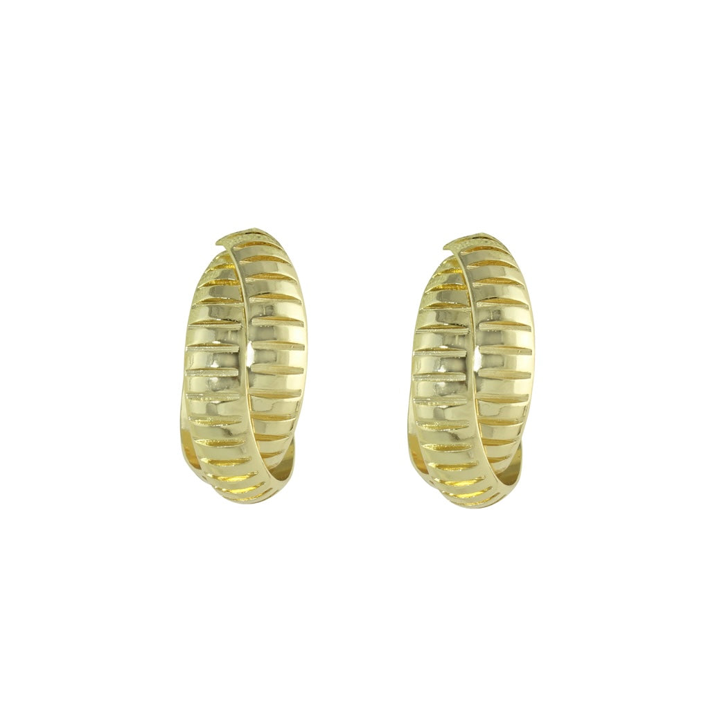 Gold plated double cobra flex hoop earrings with post back closure. Approx 1 inch in diameter.