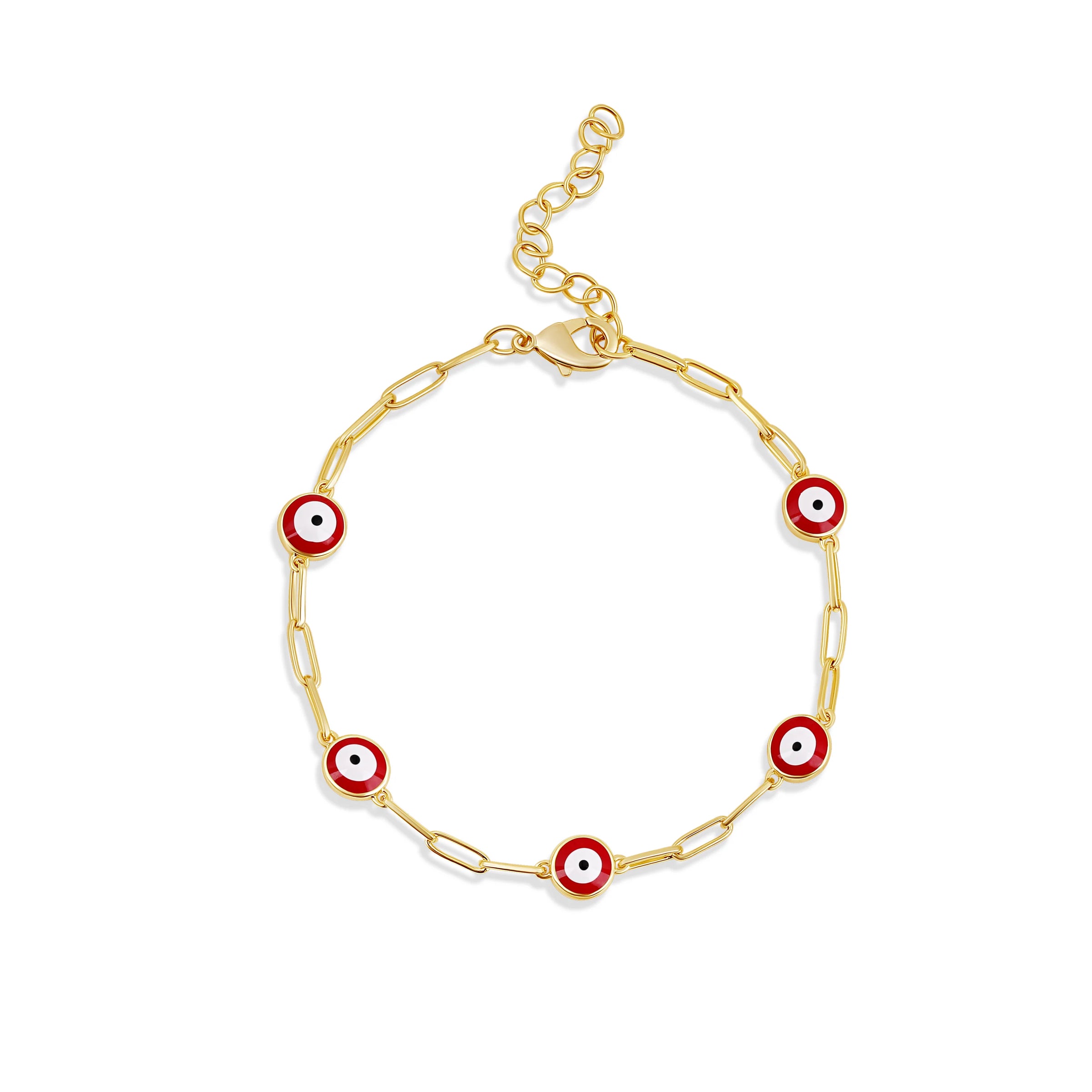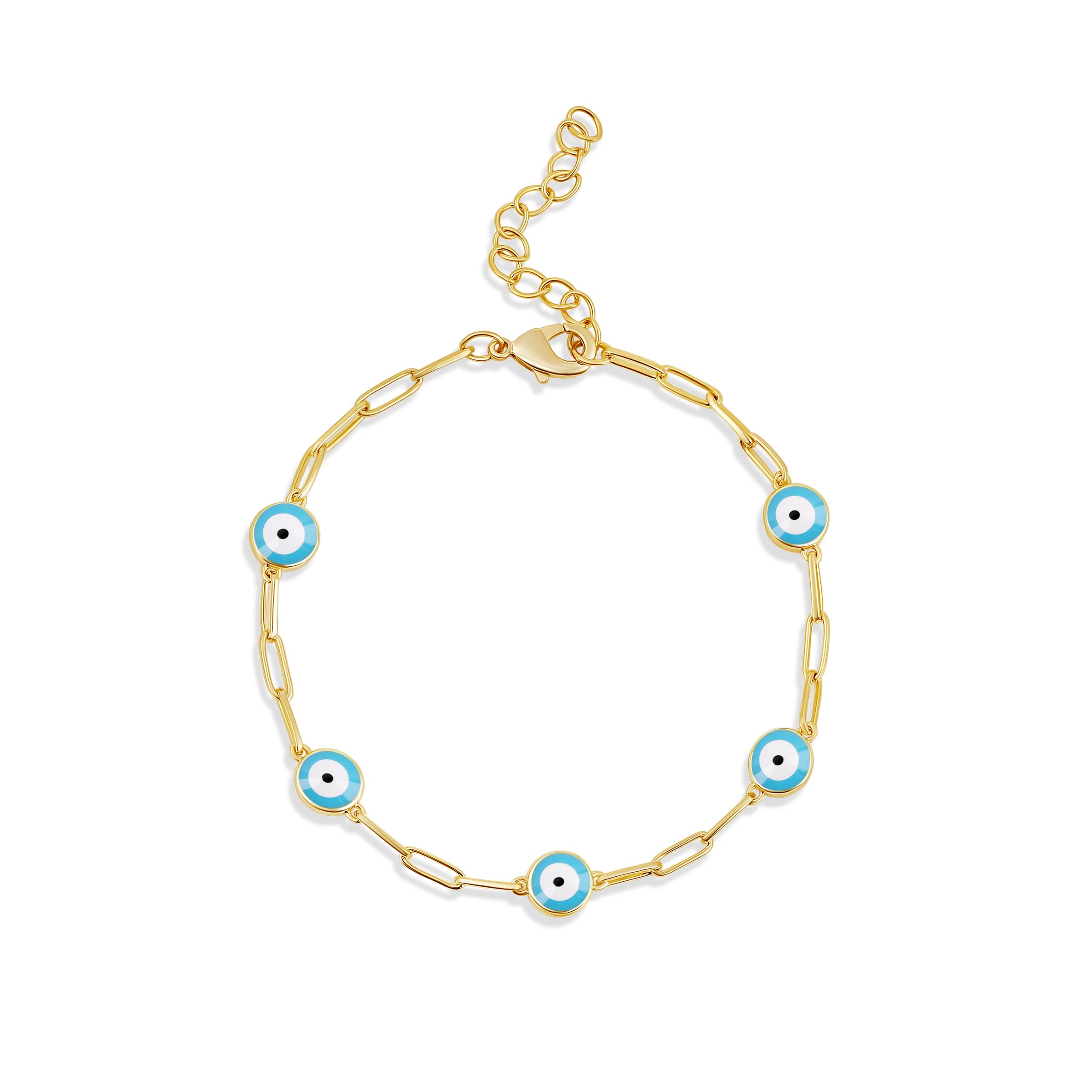 Color evil eye station bracelet. Gold paperclip bracelet with shiny color station eyes.
