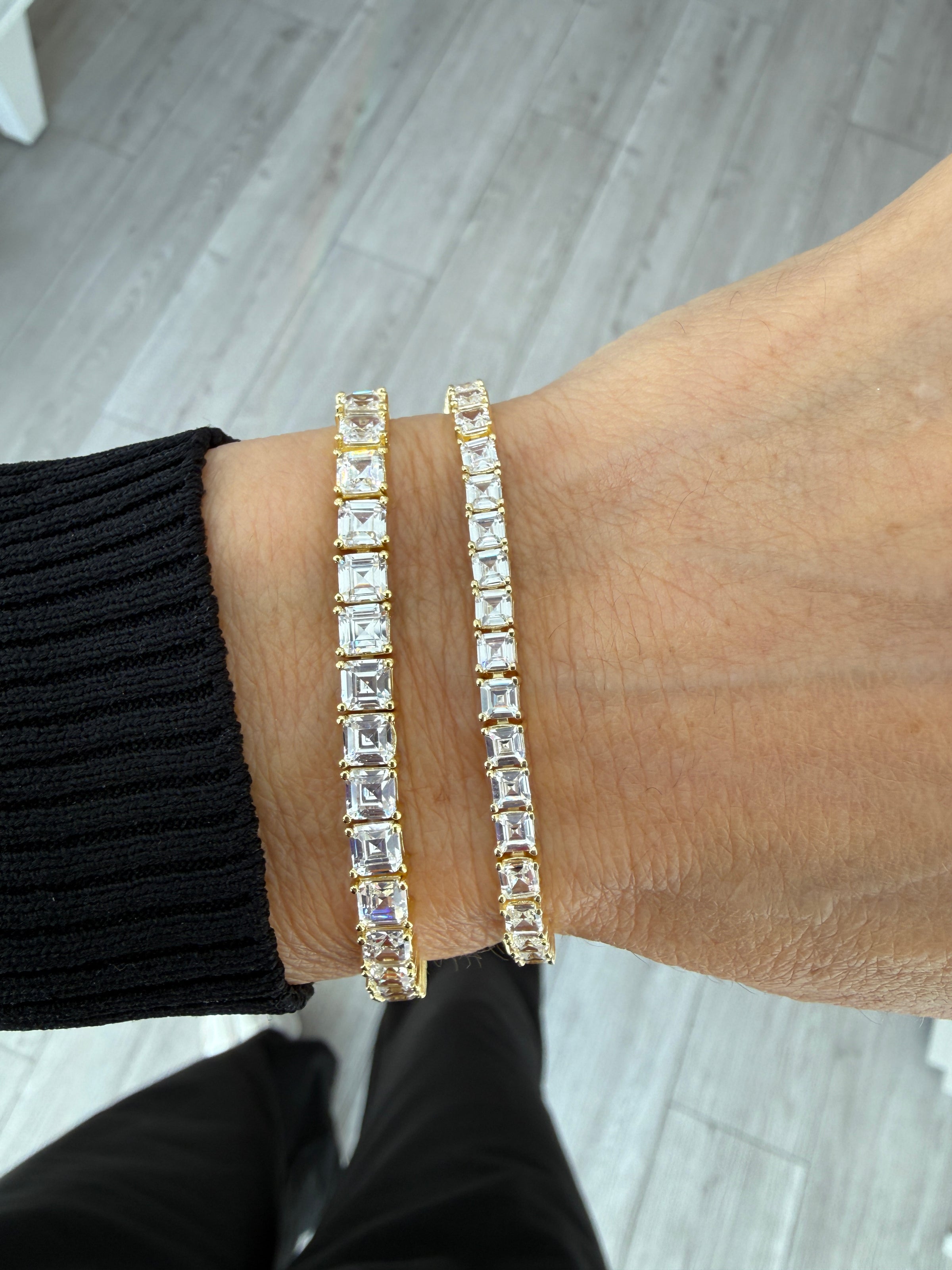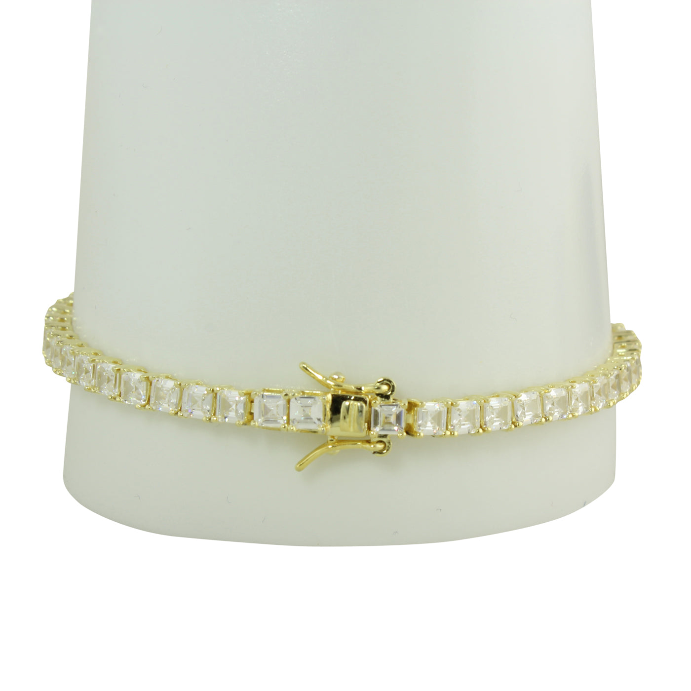 Sterling silver with 14k or rhodium finish cushion, cut tennis bracelet with 2.5mm excelling diamond cut cz. 7”