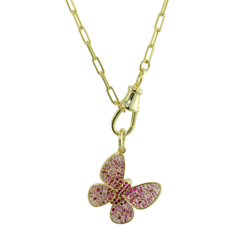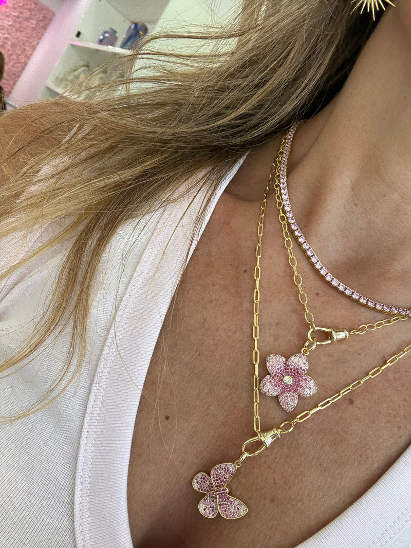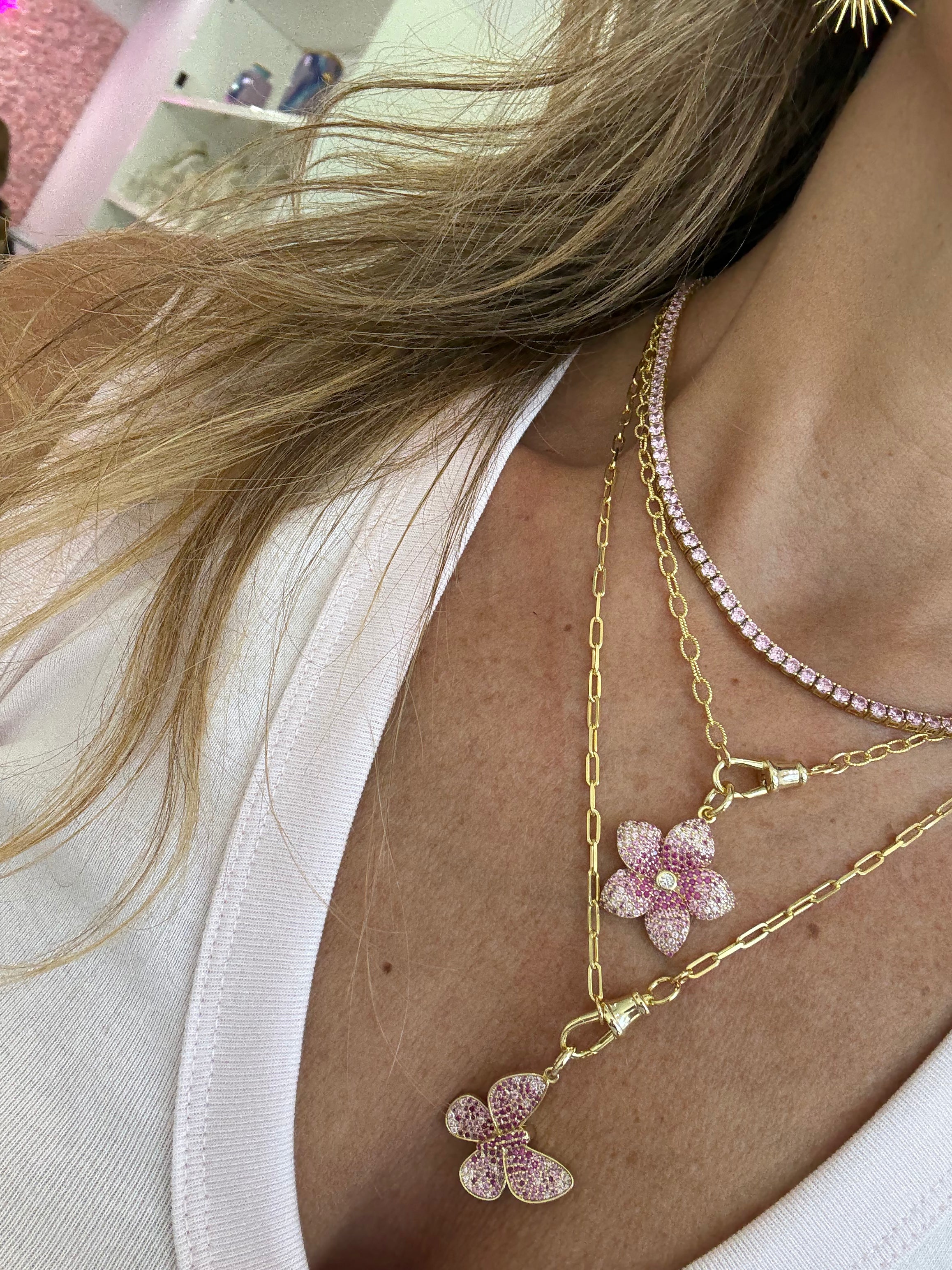 14k gold vermeil black flower necklace on paper clip link chain with fancy lobster connector. Grade A quality black, pink & white cz.