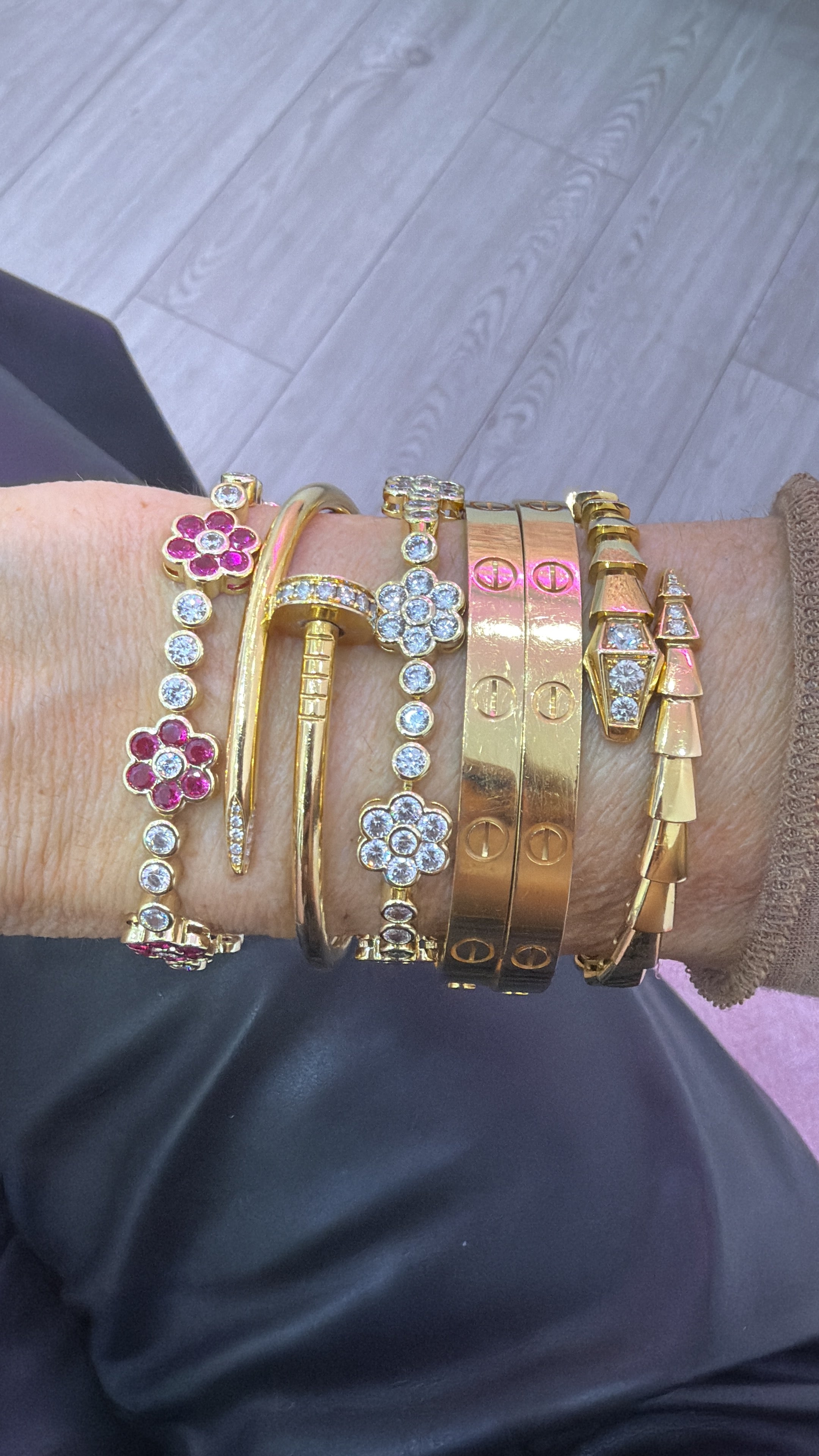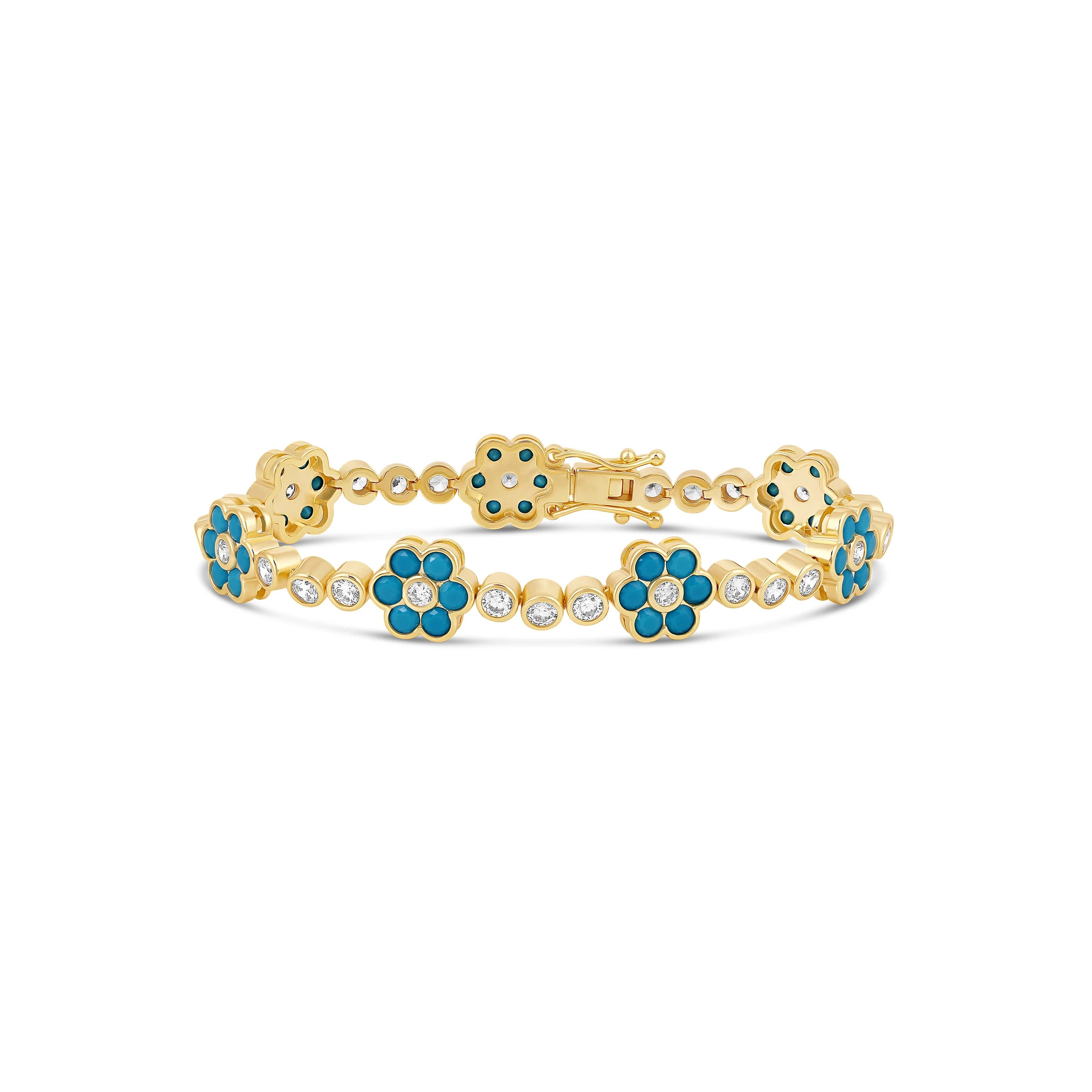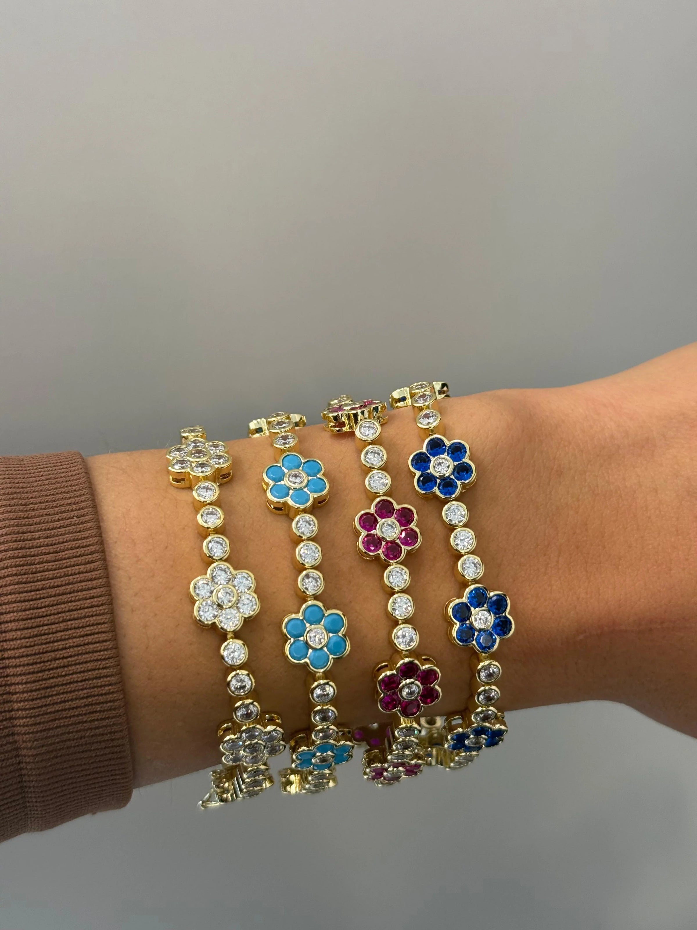 Stunning diamonti flower tennis bracelet with high quality diamond like cz stones set in clear & vibrant colors in tennis bracelet gorgeous alone or stacked with your favs.