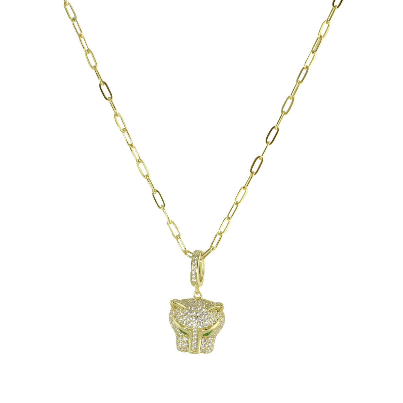 Sterling silver with 14k gold plating & micros pavè set stones. A stunning delicate panther head pendant on a 24” mini link vermeil chain.