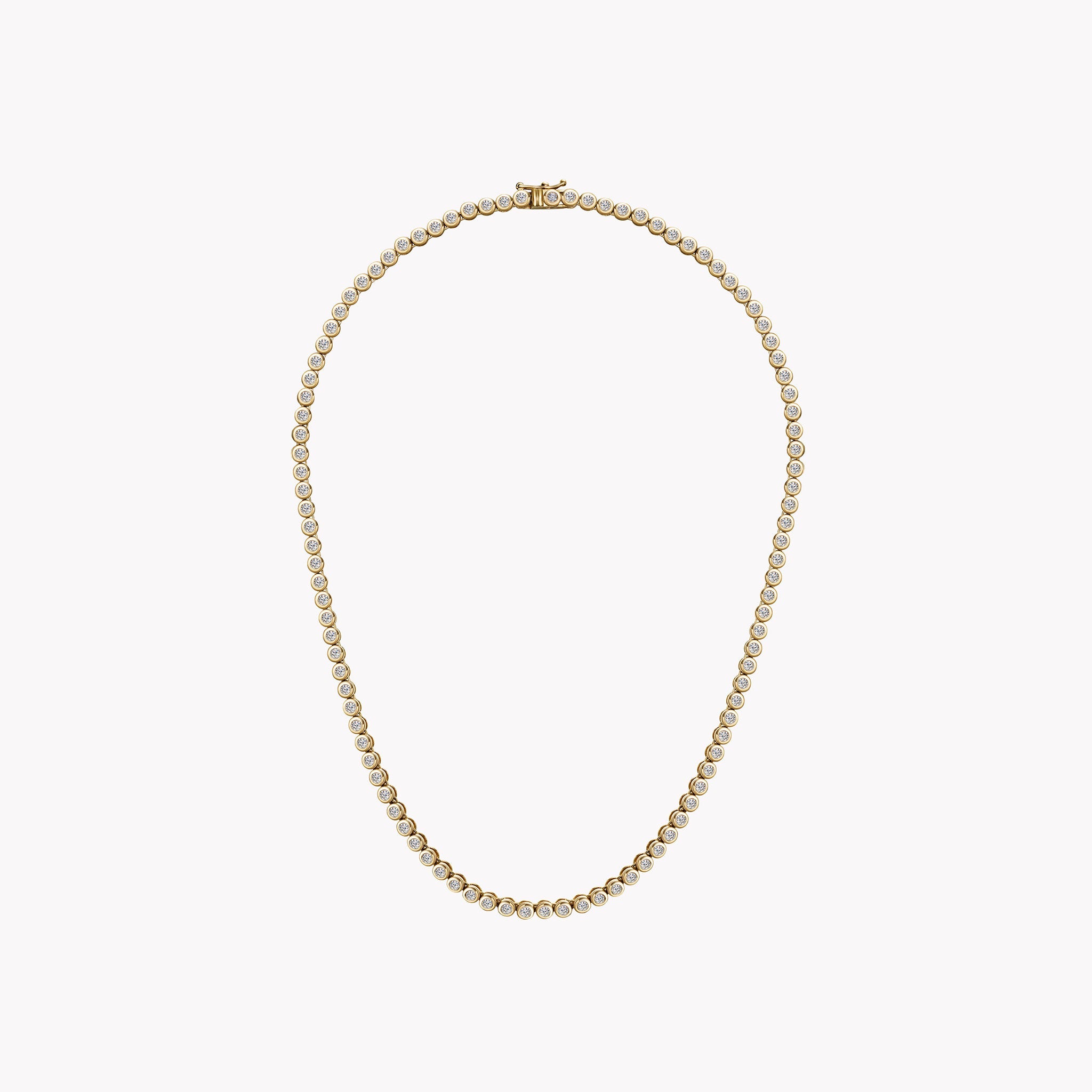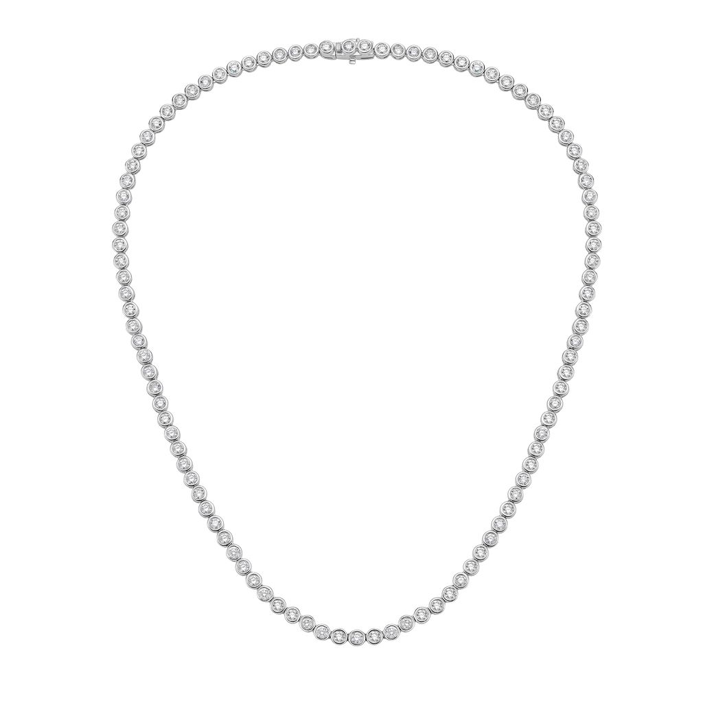 Sterling silver with rhodium or 14k gold plating bezel set tennis necklace. The modern take on a classic necklace, the gold gives a more casual feel while keeping the classic look.