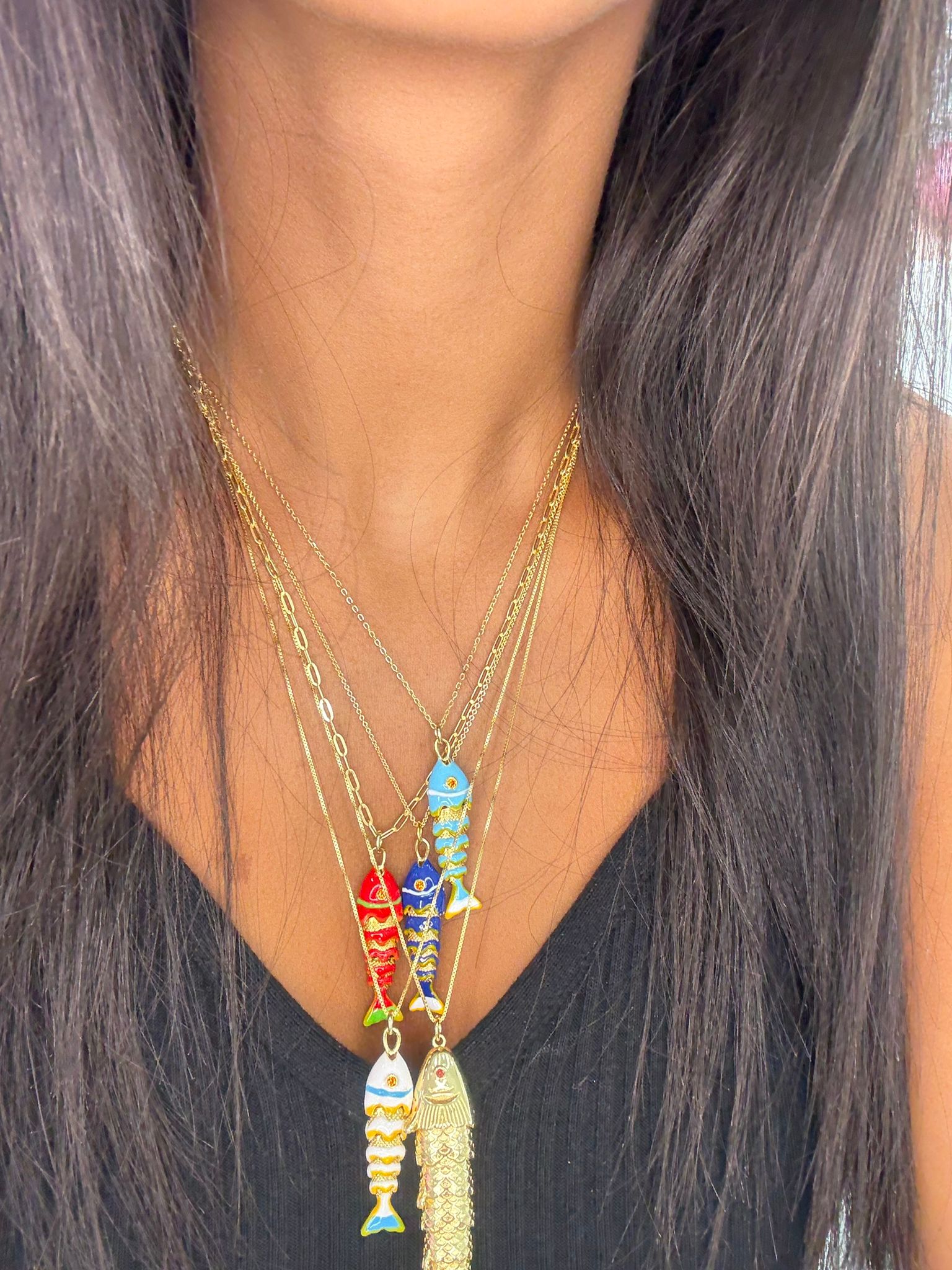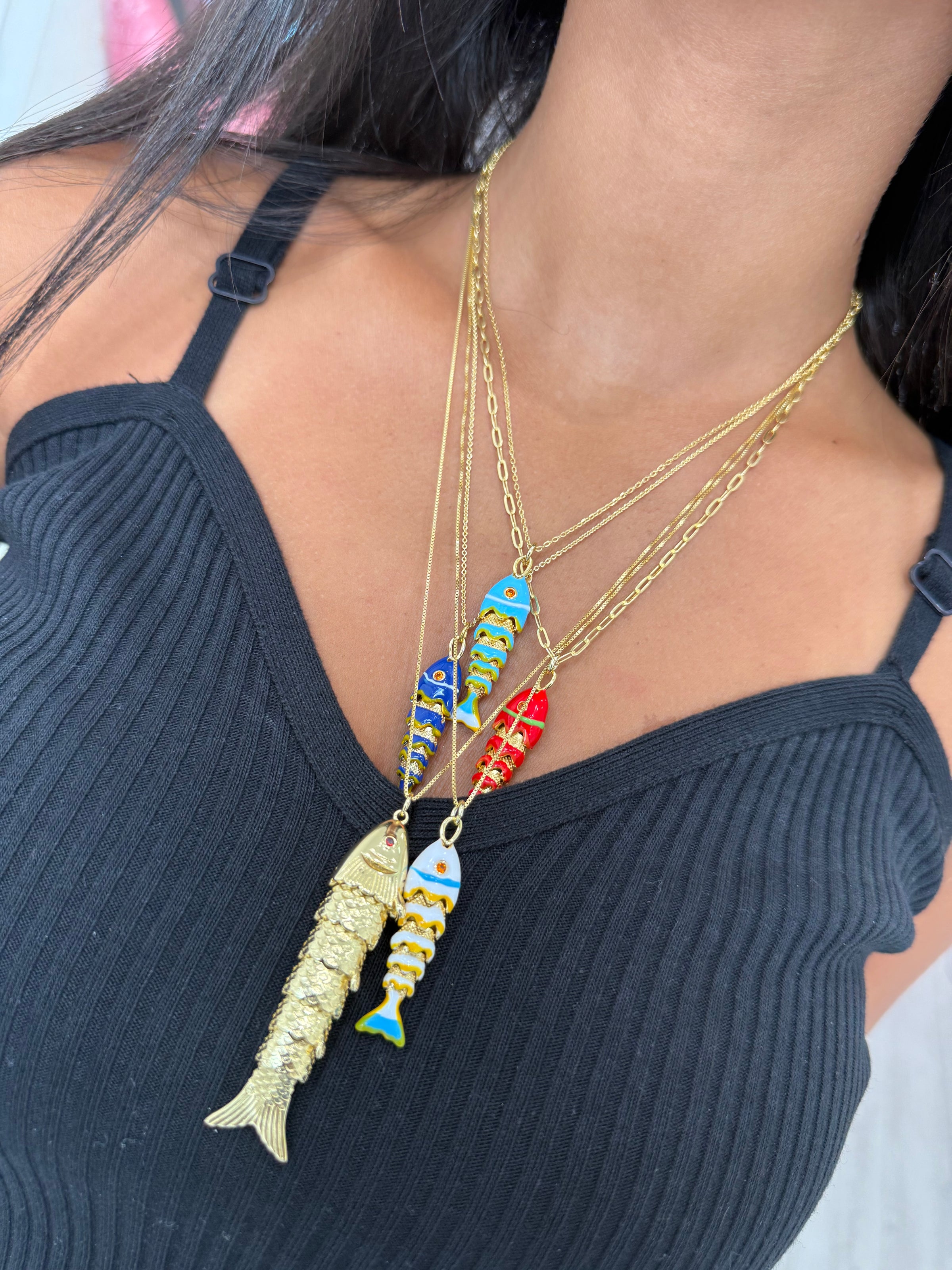 Enamel fish necklace on adjustable 16-18” chain. 1.5” fish length. Mini fish is smaller. We also carry the larger gold fish shown in one of the images.